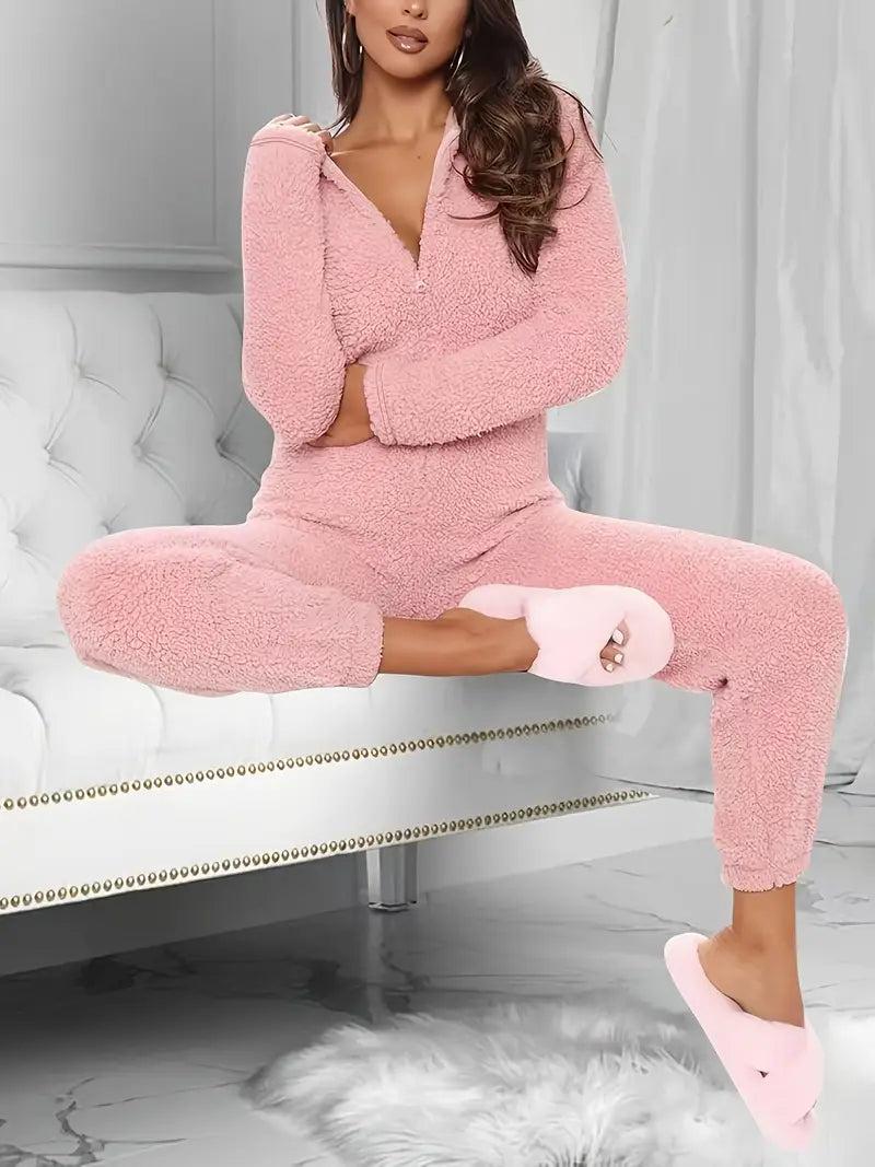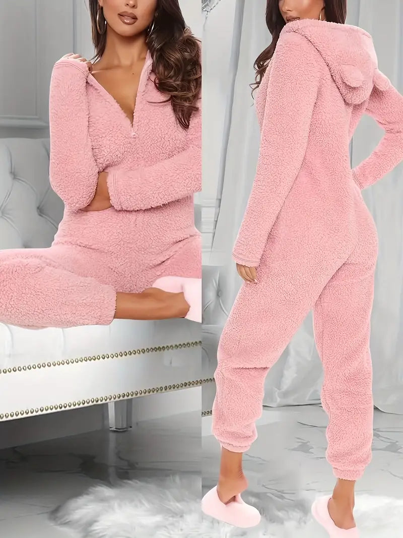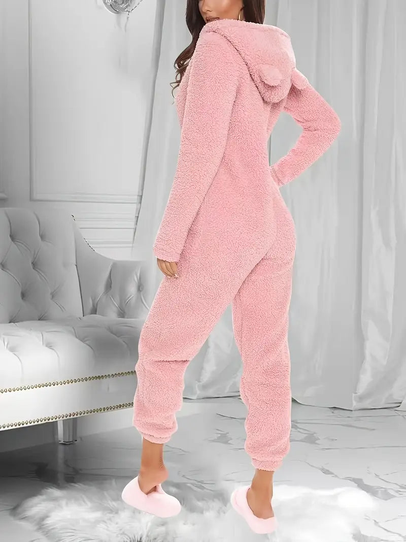 Wyobraź sobie, że cały świat za oknem zwalnia, a Ty zanurzasz się w absolutnym relaksie. Ten kombinezon jest jak najcieplejszy uścisk – jego pluszowa, niezwykle miękka faktura sprawia, że masz ochotę wtulić się w niego i nie wychodzić z domu przez cały weekend. Urocze uszka na kapturze dodają mu dziewczęcego uroku, a praktyczny zamek i kieszenie sprawiają, że jest nie tylko słodki, ale też super funkcjonalny. To idealny strój na serialowy maraton, poranek z kawą na kanapie czy wieczór z maseczką i dobrą książką.